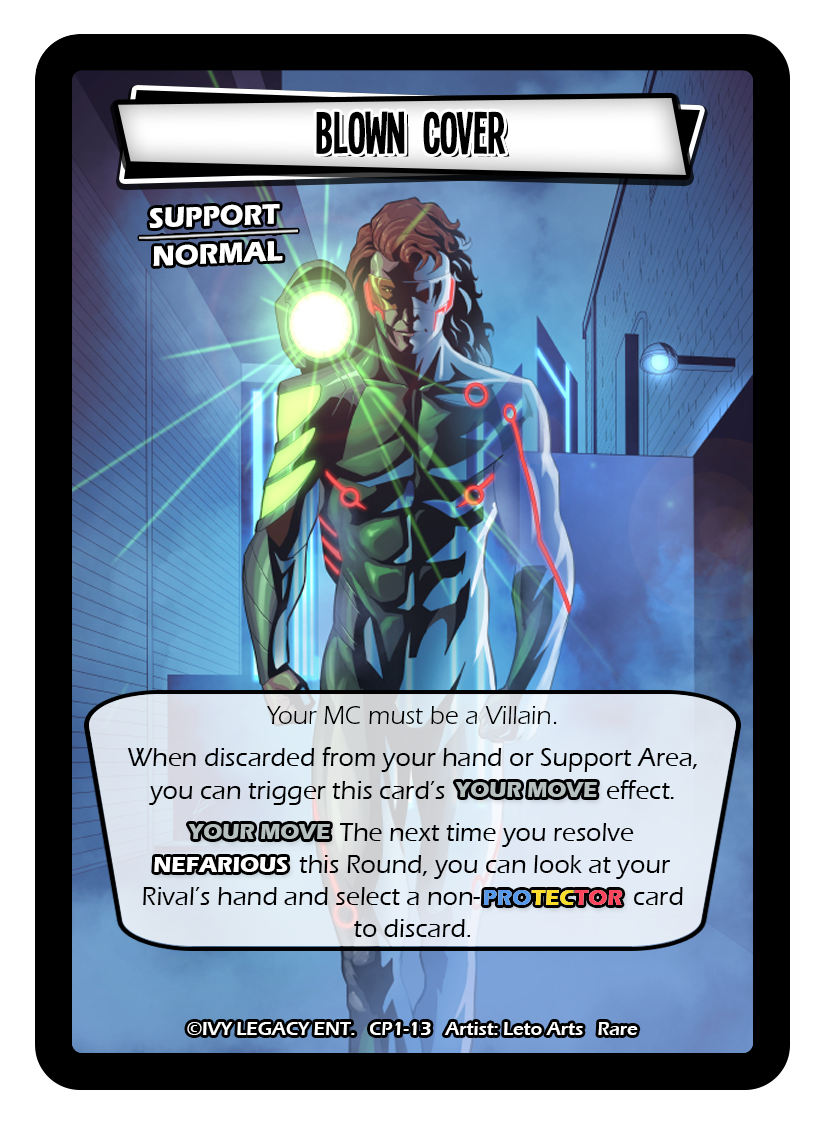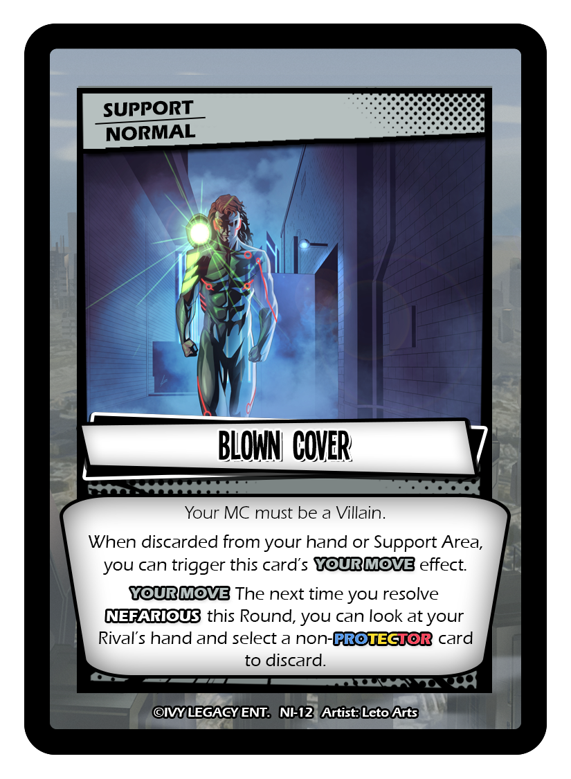 Text: Your MC must be a Villain. When discarded from your hand or Support Area, you can trigger this card’s YOUR MOVE effect. YOUR MOVE The next time you resolve *NEFARIOUS* this Round, you can look at your Rival’s hand and select a non-*PROTECTOR* card to discard.