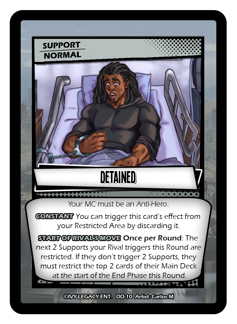 Text: Your MC must be an Anti-Hero. CONSTANT You can trigger this card's effect from your Restricted Area by discarding it. START OF RIVAL'S MOVE Once per Round: The next 2 Supports your Rival triggers this Round are restricted. If they don't trigger 2 Supports, they must restrict the top 2 cards of their Main Deck at the start of the End Phase this Round.