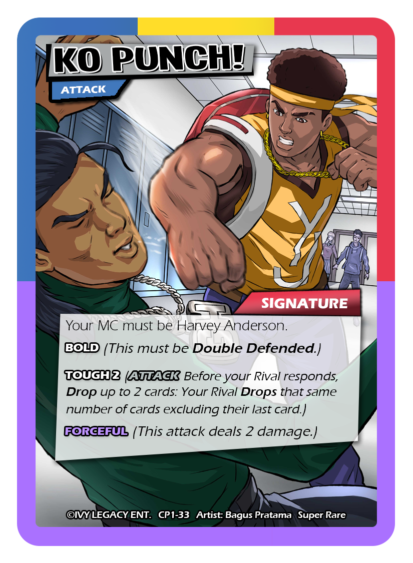 Text: Your MC must be Harvey Anderson. *BOLD* (This must be Double Defended.) *TOUGH 2* (ATTACK Before your Rival responds, Drop up to 2 cards: Your Rival Drops that same number of cards excluding their last card.) *FORCEFUL* (This attack deals 2 damage.)