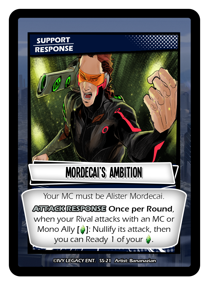 Text: Your MC must be Alister Mordecai. ATTACK RESPONSE Once per Round, when your Rival attacks with an MC or Mono Ally [1]: Nullify its attack, then you can Ready 1 of your Crystals.