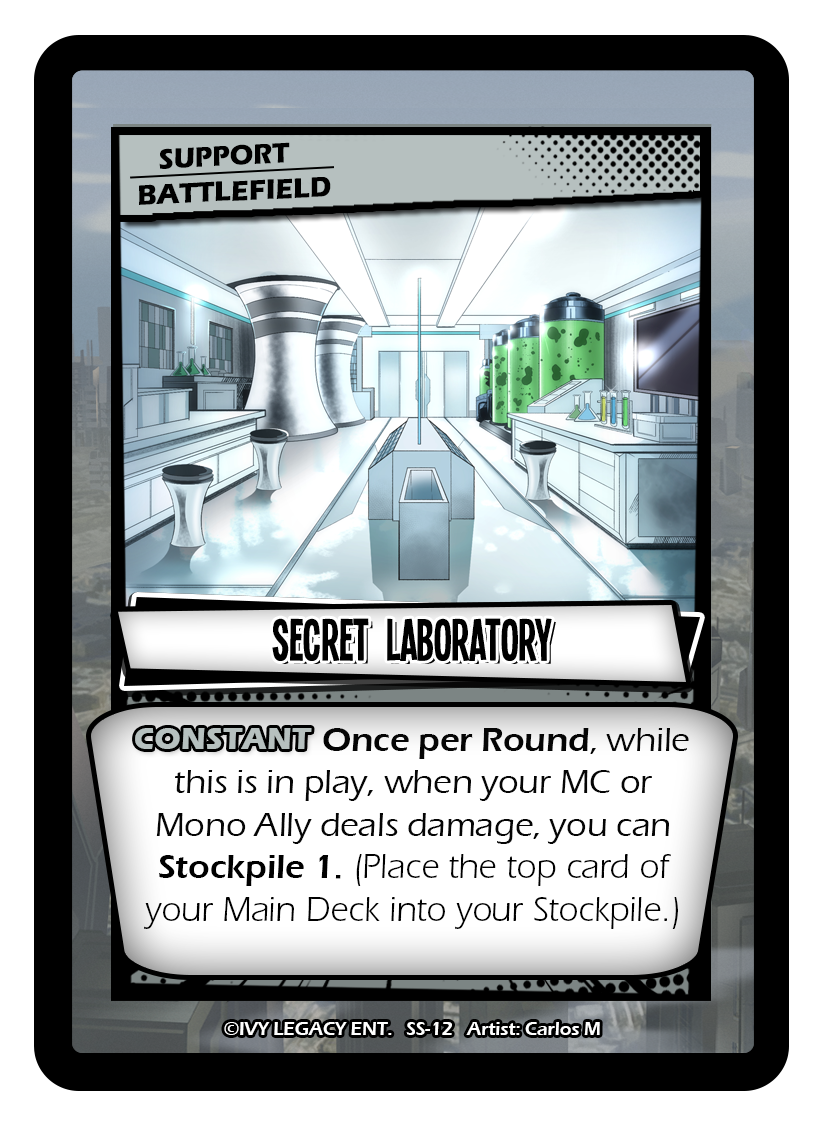 Text: CONSTANT Once per Round, while this is in play, when your MC or Mono Ally deals damage, you can Stockpile 1. (Place the top card of your Main Deck into your Stockpile.)